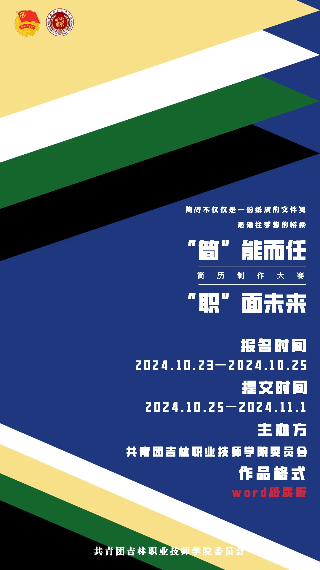 在这个充满机遇与挑战的时代,一份出色的简历是通往梦想的敲门砖。简历不仅展示着我们的教育背景、专业技能以及实践经验,更是我们职业素养和综合能力的关键体现。为了进一步提升技师学子简历制作能的力,激发创新思维,提高实际操作能力,使他们能够更好地适应未来职场需求。校团委特此举办“‘简’能而任,‘职’面未来”简历制作大赛,诚邀每一位怀揣梦想的同学,一起扬帆起航,开启未来职场新篇章!