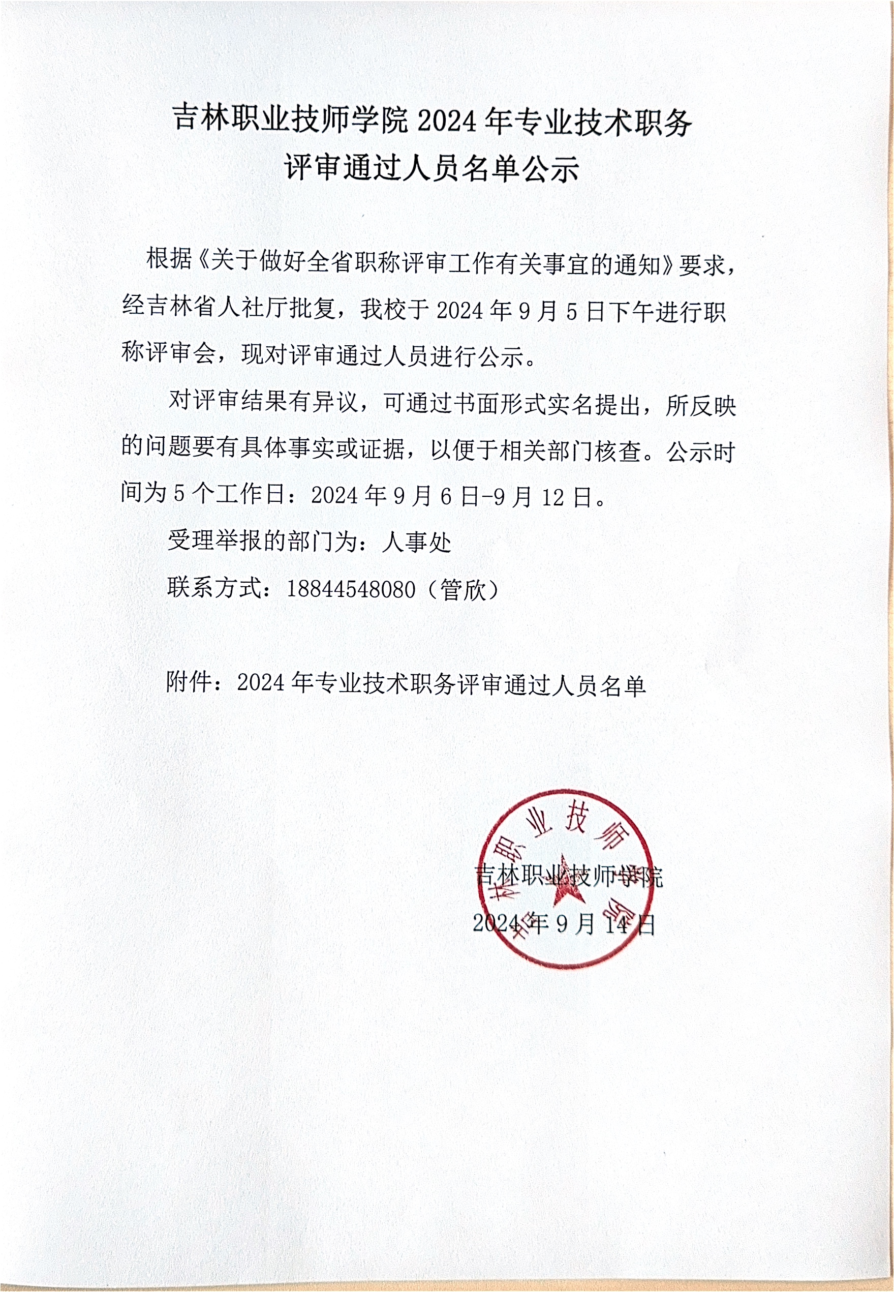 吉林职业技师学院2024年专业技术职务评审通过人员名单公示