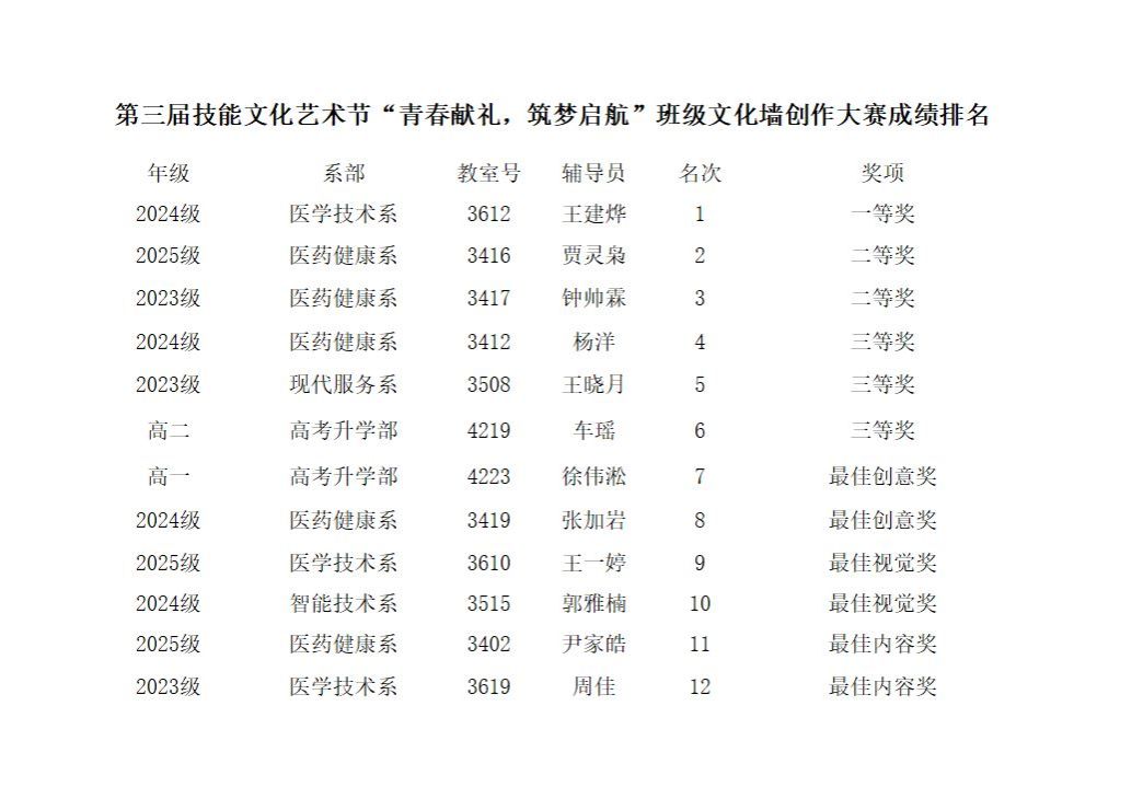 最终,经过专业的评审和严格的核算,2024级医学技术系王建烨班级斩获“一等奖”;2025级医药健康系贾灵枭班级、2023级医药健康系钟帅霖班级荣获“二等奖”;2023级医药健康系杨洋班级、2023级现代服务系王晓月班级、高考升学部高二车瑶班级荣获“三等奖”。