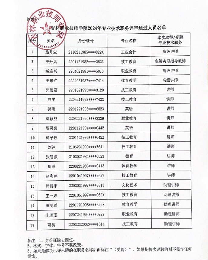 吉林职业技师学院2024年专业技术职务评审通过人员名单公示